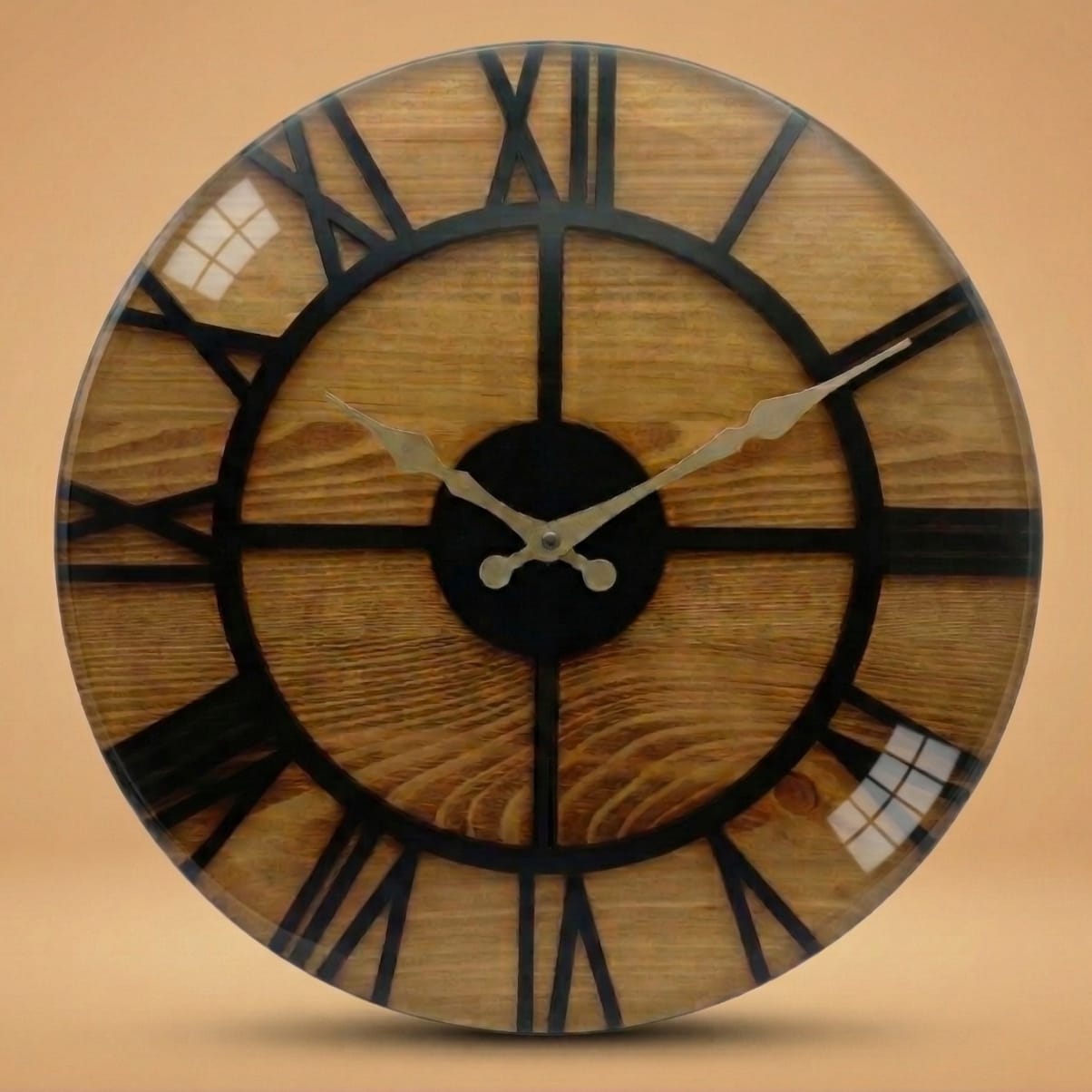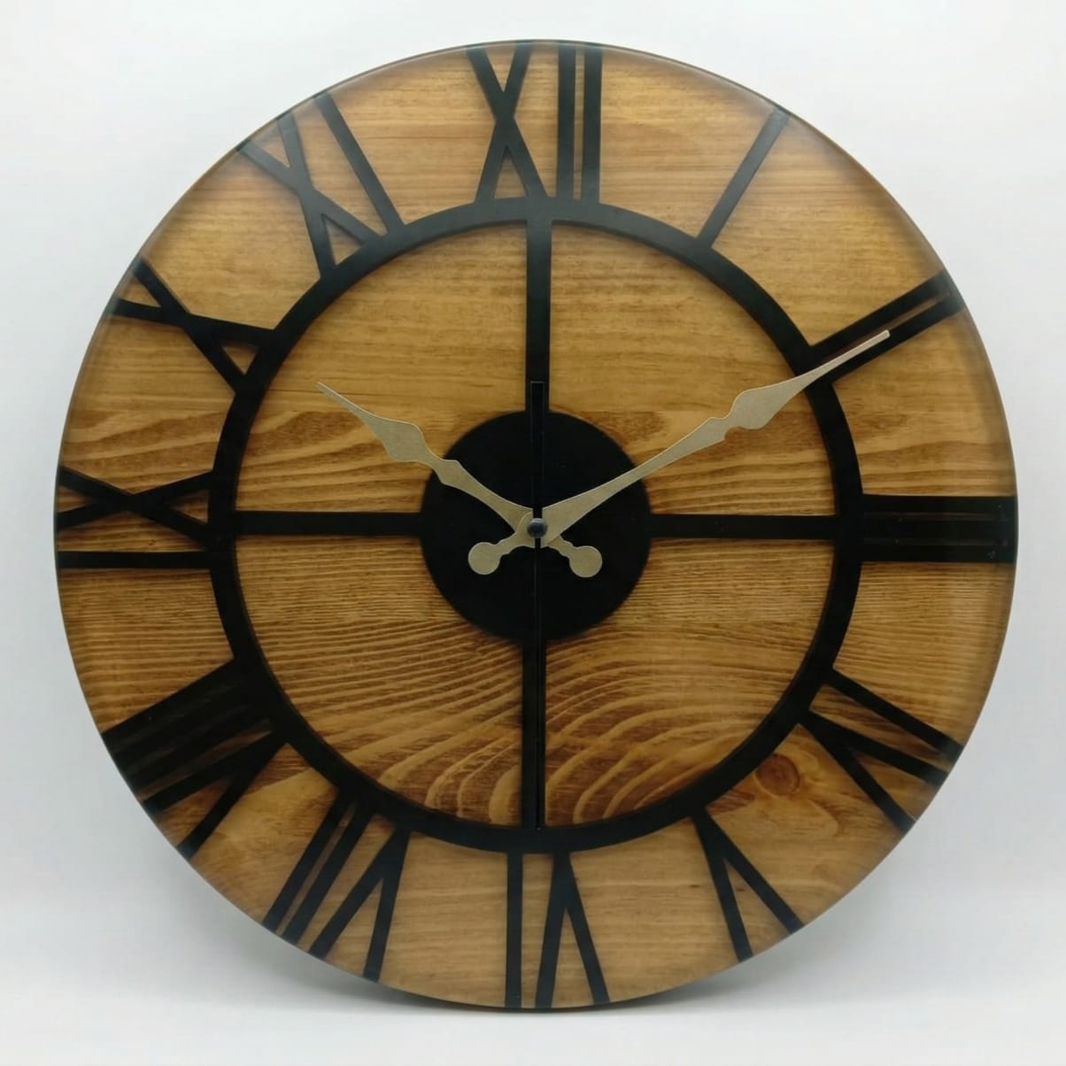 Crafted from natural fir wood, the clock highlights the light tone and natural grain of the material. The front surface is fully coated with clear epoxy, creating a glossy protective finish that enhances durability and gives the clock a smooth appearance. Metal hour and minute hands ensure clear time display.