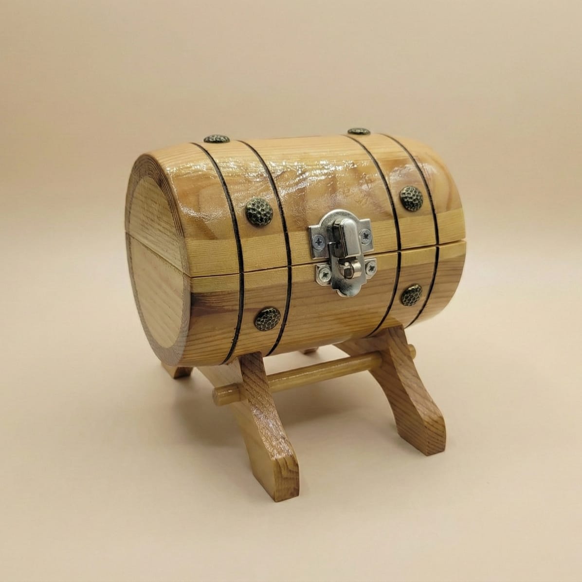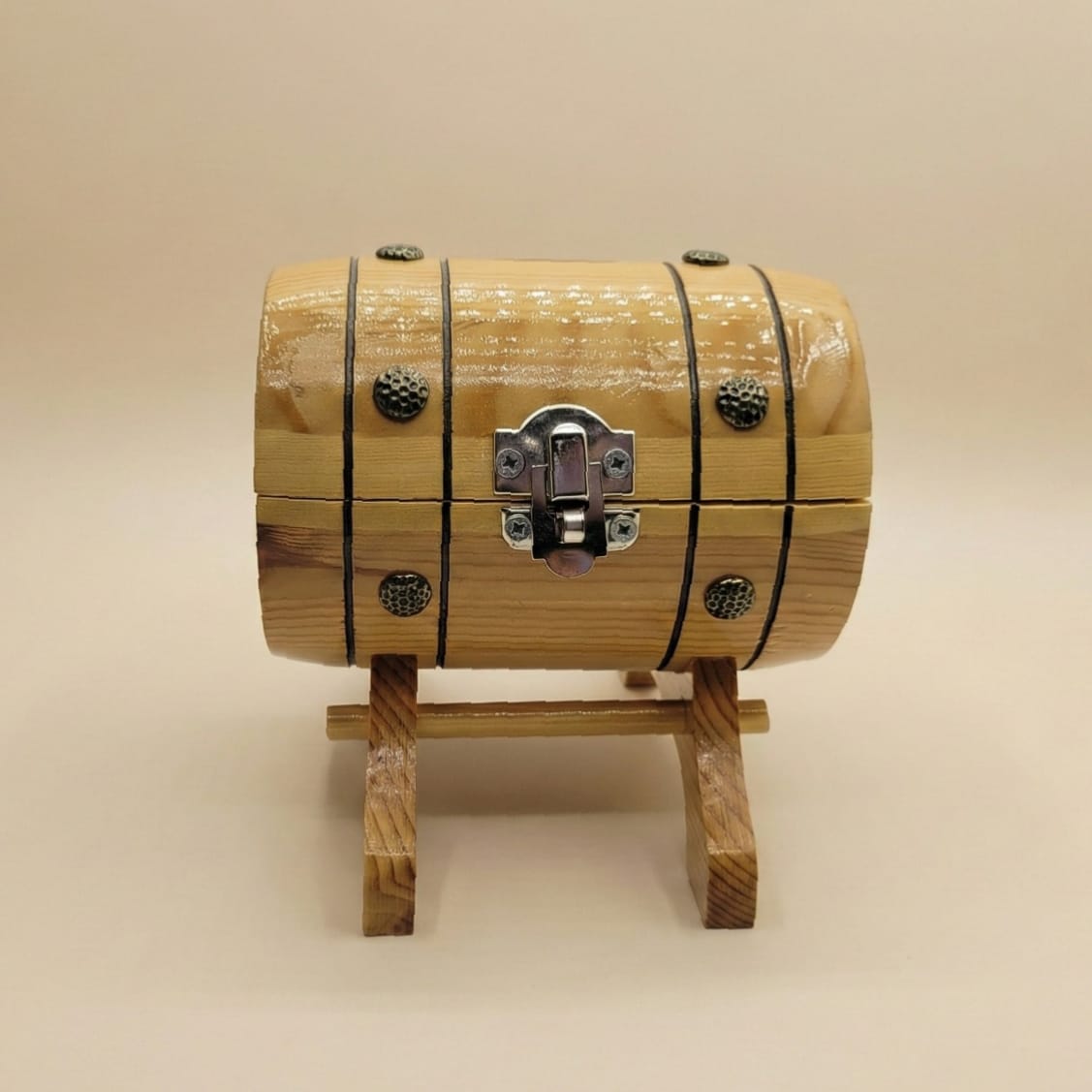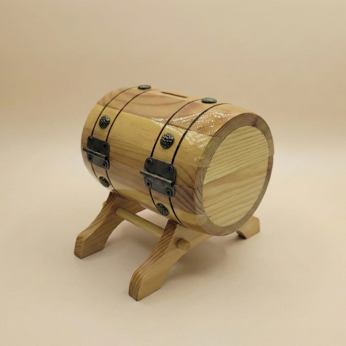 The surface is finished with a glossy varnish, providing basic protection while giving the wood a clean and polished appearance. The product is intended for everyday use as a money storage item.