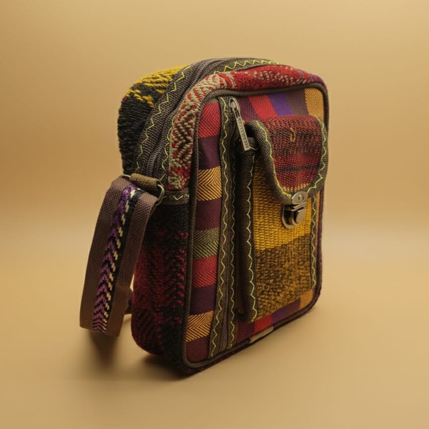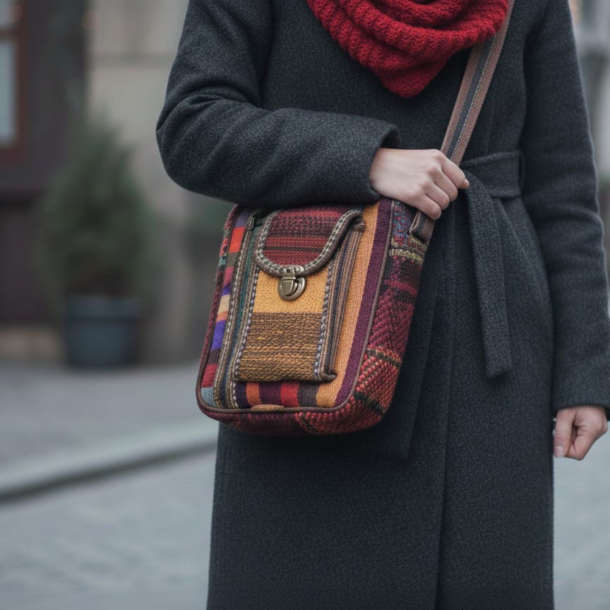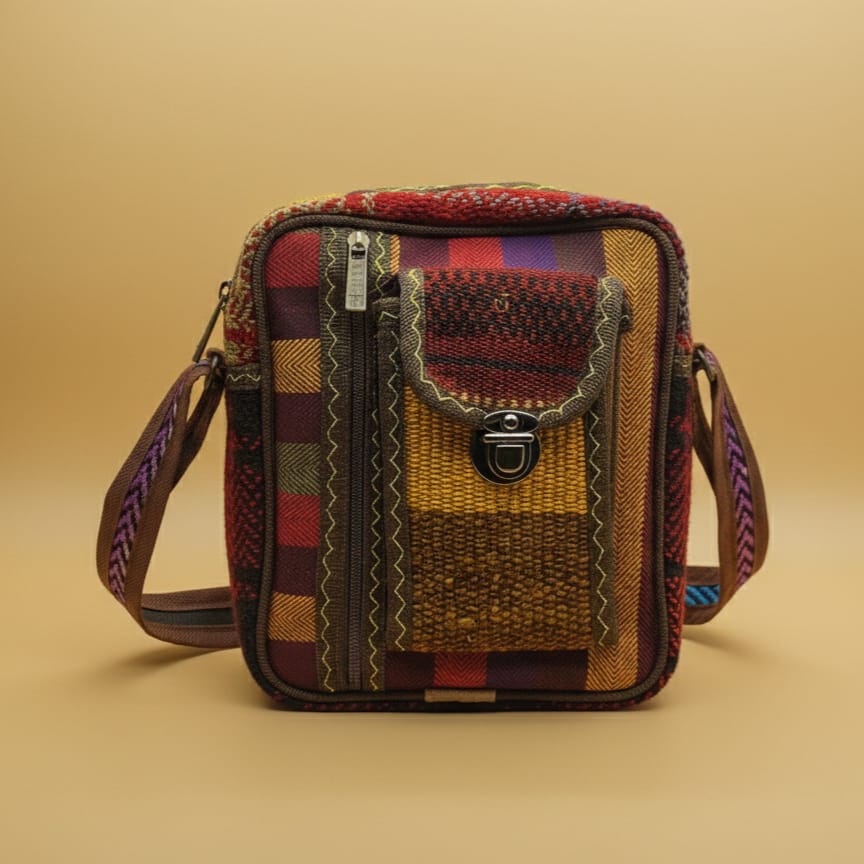 Celfin Bag is a woven fabric shoulder bag designed for daily use. Its structure includes two separate compartments, consisting of a main storage section and an additional front pocket with a zipper for easy access to smaller items.