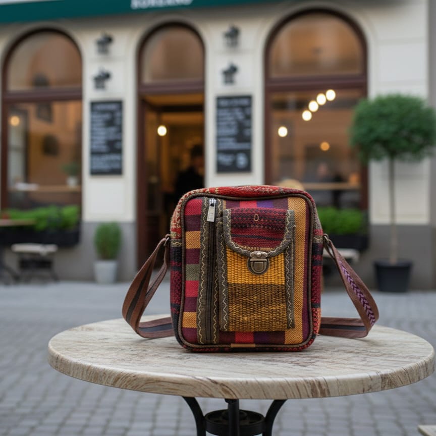 The bag is designed to be worn over the shoulder, providing practical and comfortable carrying. The surface features Anatolian motif patterns, adding visual character to the overall design.