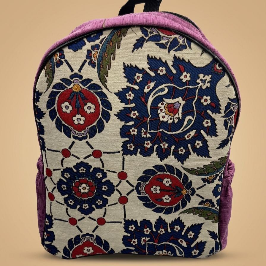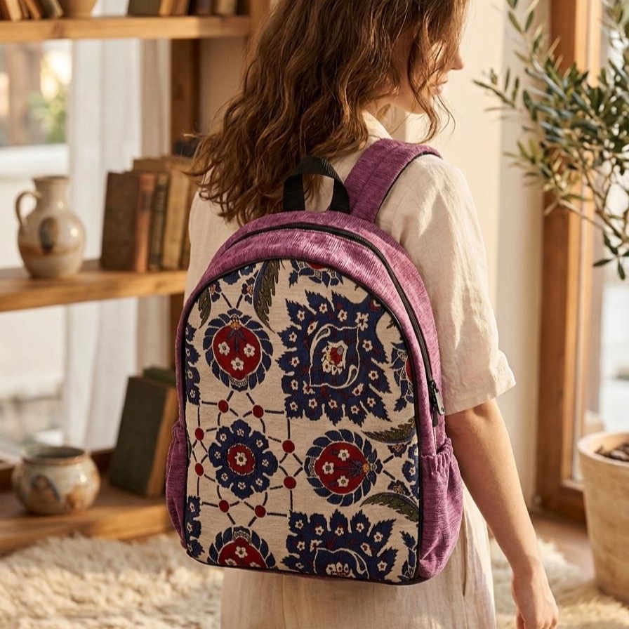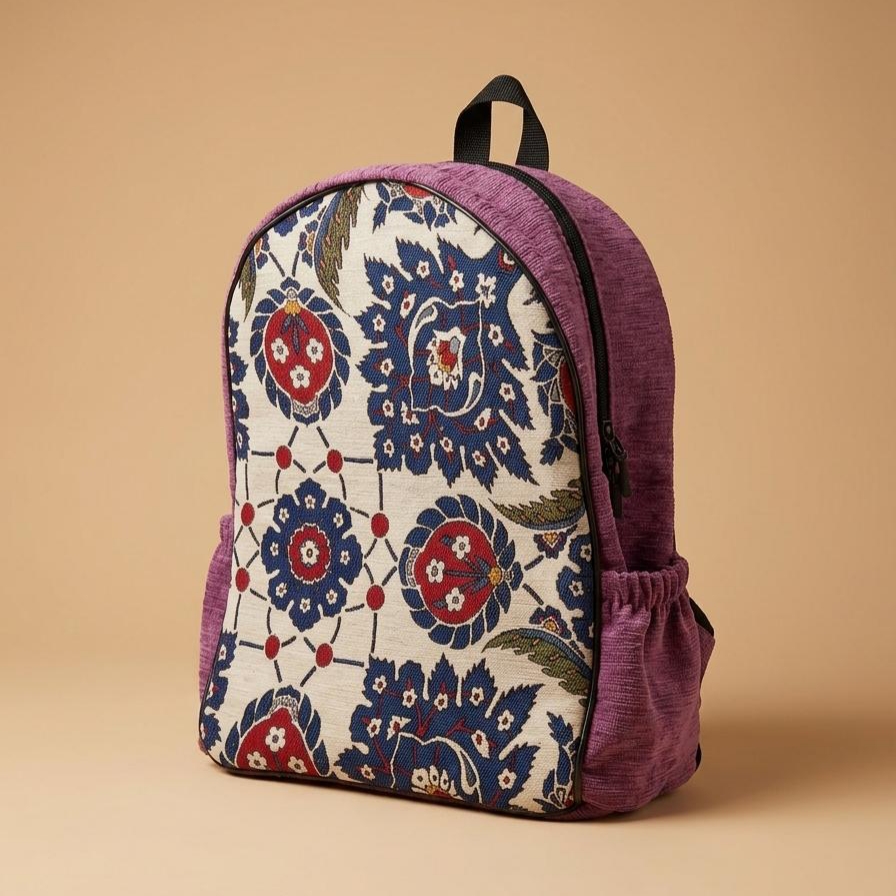 The Gimba Backpack is an ideal accessory for daily use, bringing together traditional weaving aesthetics with a modern and ergonomic design. The rich floral and geometric motifs on the front panel recall classic hand-woven styles, while the purple-toned body offers a contemporary elegance.