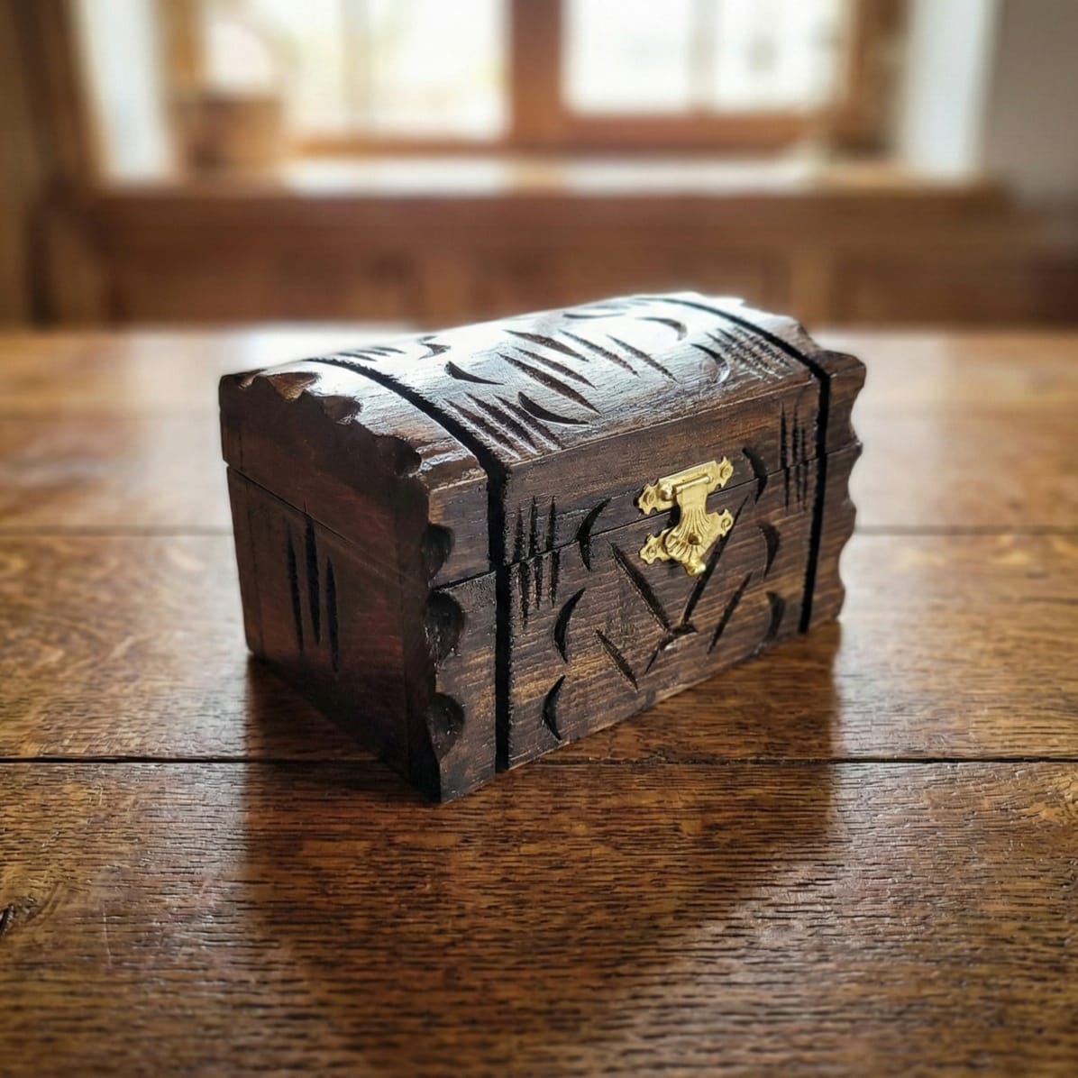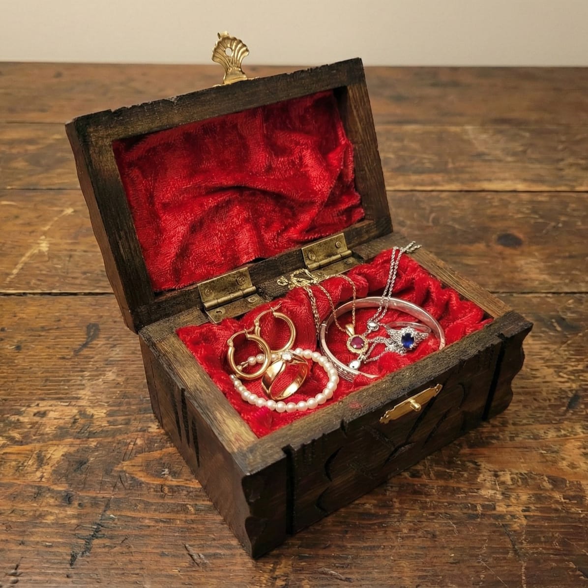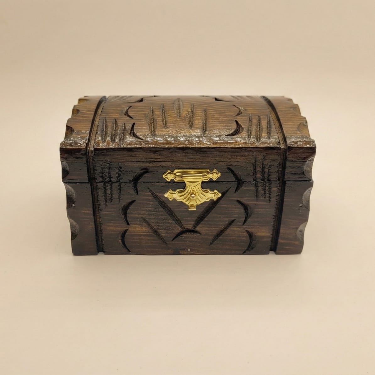 Ceviz ağacından üretilen gövde, yüzeydeki işleme detaylarıyla doğal dokuyu ön plana çıkarır. İç bölümde yer alan kadife kumaş kaplama, hassas eşyalar için yumuşak ve koruyucu bir saklama alanı sunar.
